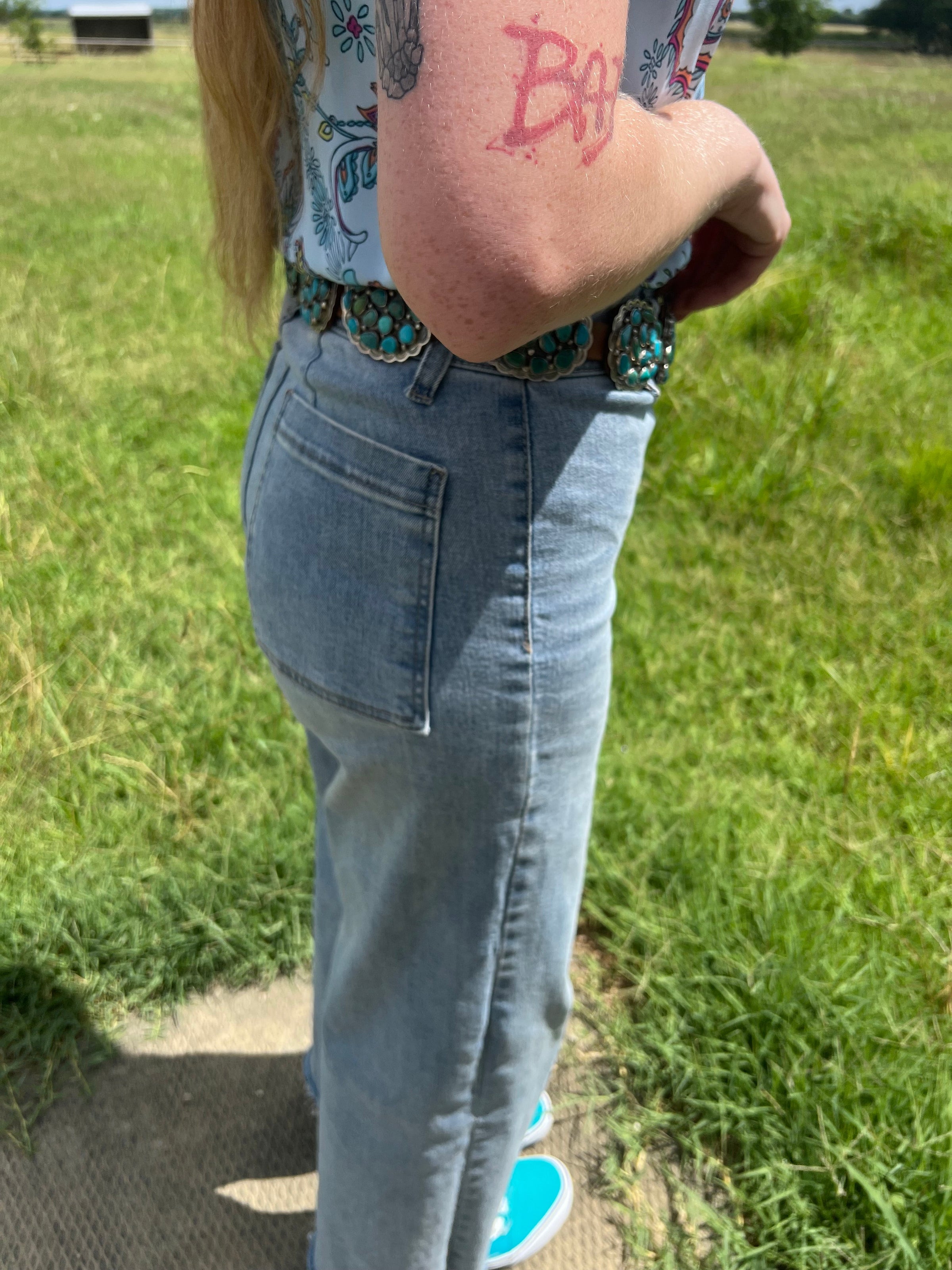 The belt measures 52.5 inches with the buckle, but can be adjusted down to 29 inches by sliding the conchos together. Versatile and adaptable, it can fit many body types and be worn in different ways: