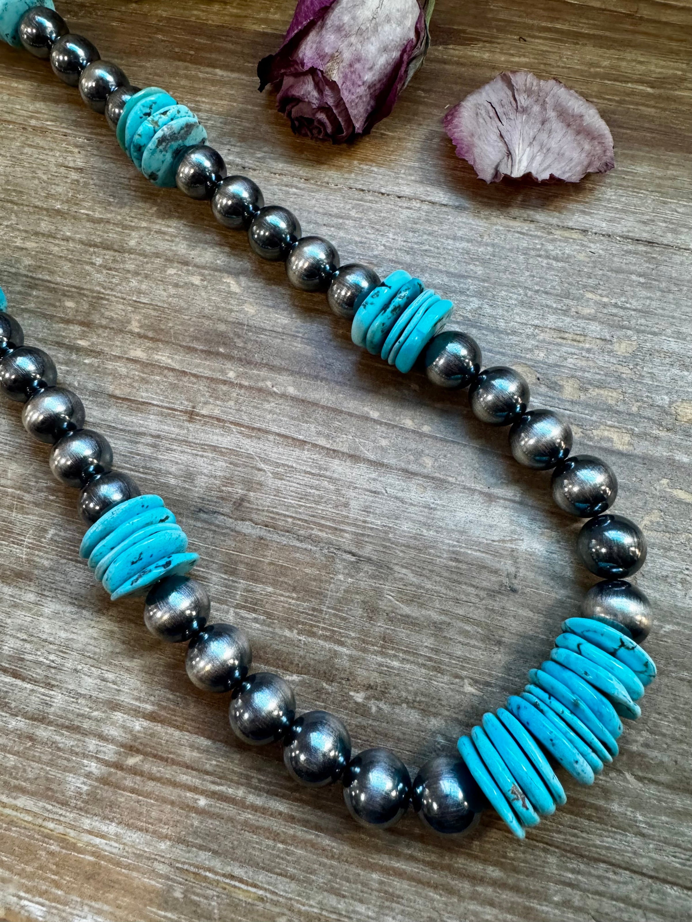 Part of our exclusive NFR Collection, this one-of-a-kind necklace was handmade in the USA by The Bijoux FAB. Measuring 35 inches long, it features a stunning combination of 8mm and 14mm sterling silver pearls, finished with a non-tarnish hook for durability. At its center sits a bold 20mm blue turquoise rondelle, adding the perfect Western touch. Only one was made — a true collector’s piece that stands out with its handcrafted detail and high-quality materials.