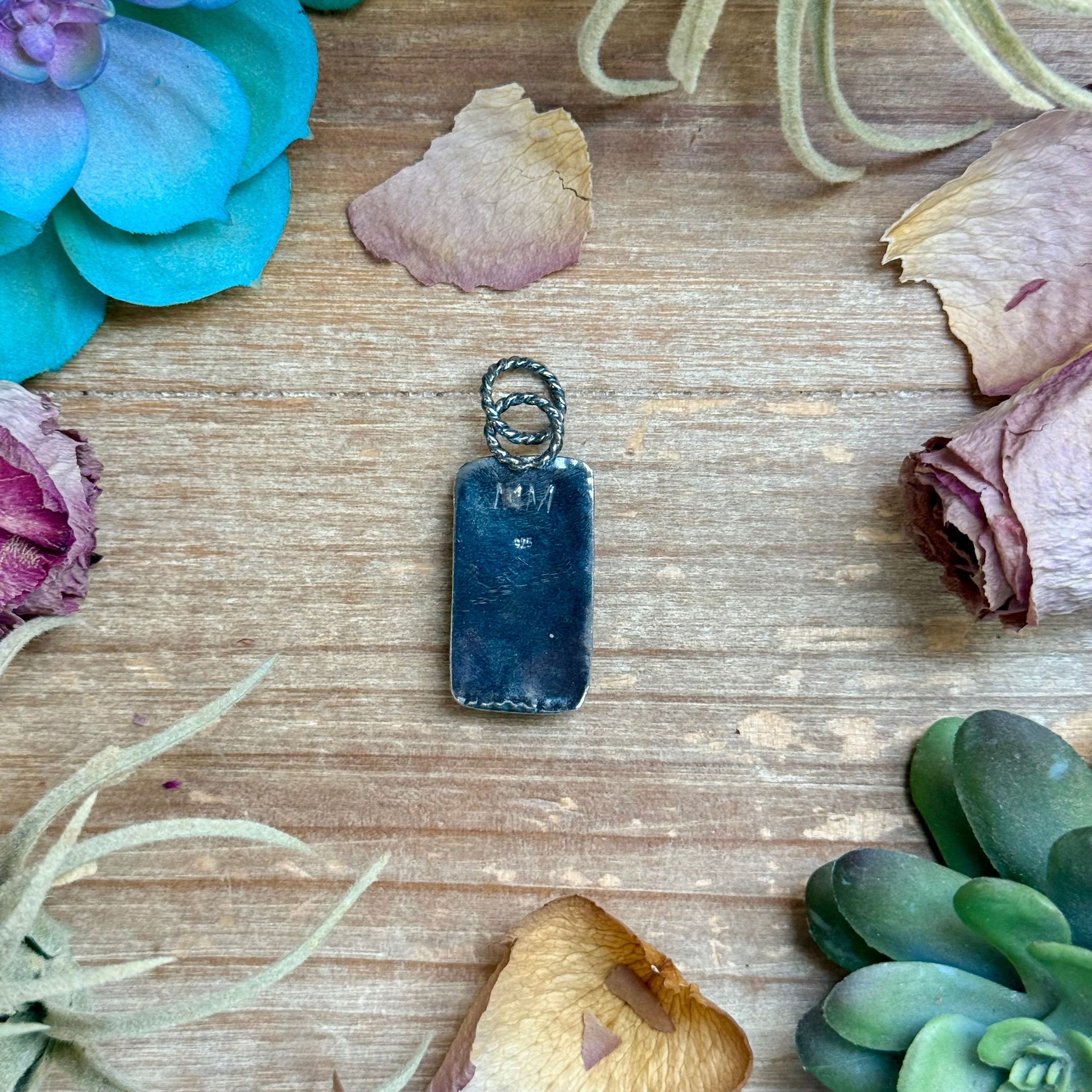 This one-of-a-kind turquoise pendant is handcrafted in-house using traditional silversmith work and features a real turquoise stone set in solid sterling silver. Designed to fit 6mm pearl necklaces, this pendant measures approximately 1 1/2 inches tall by 1/2 inch wide, making it a clean yet striking statement piece.