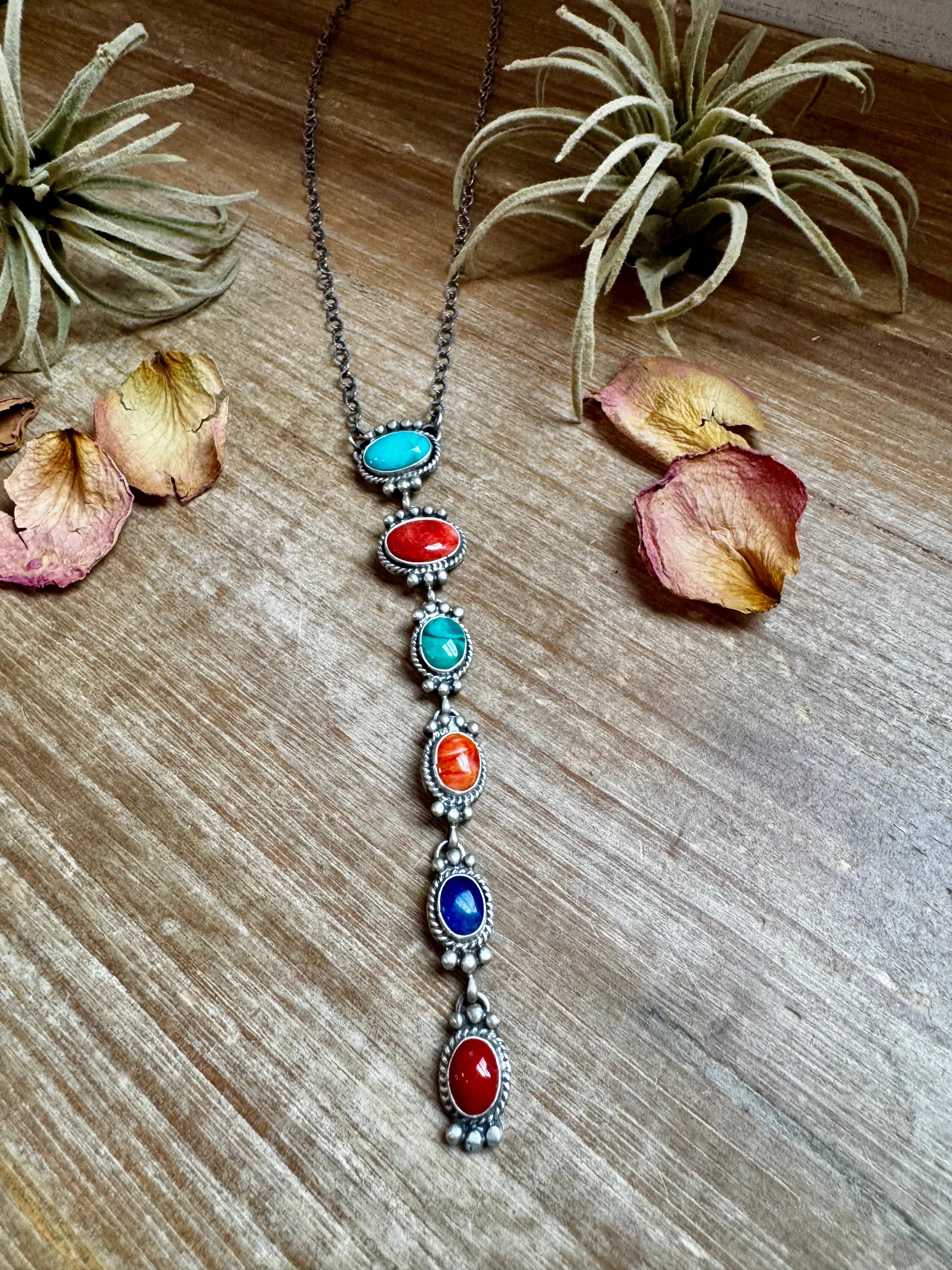 Sterling Silver Lariat Necklace – Native Made – Turquoise, Spiny, & Lapis Charms – One of a Kind