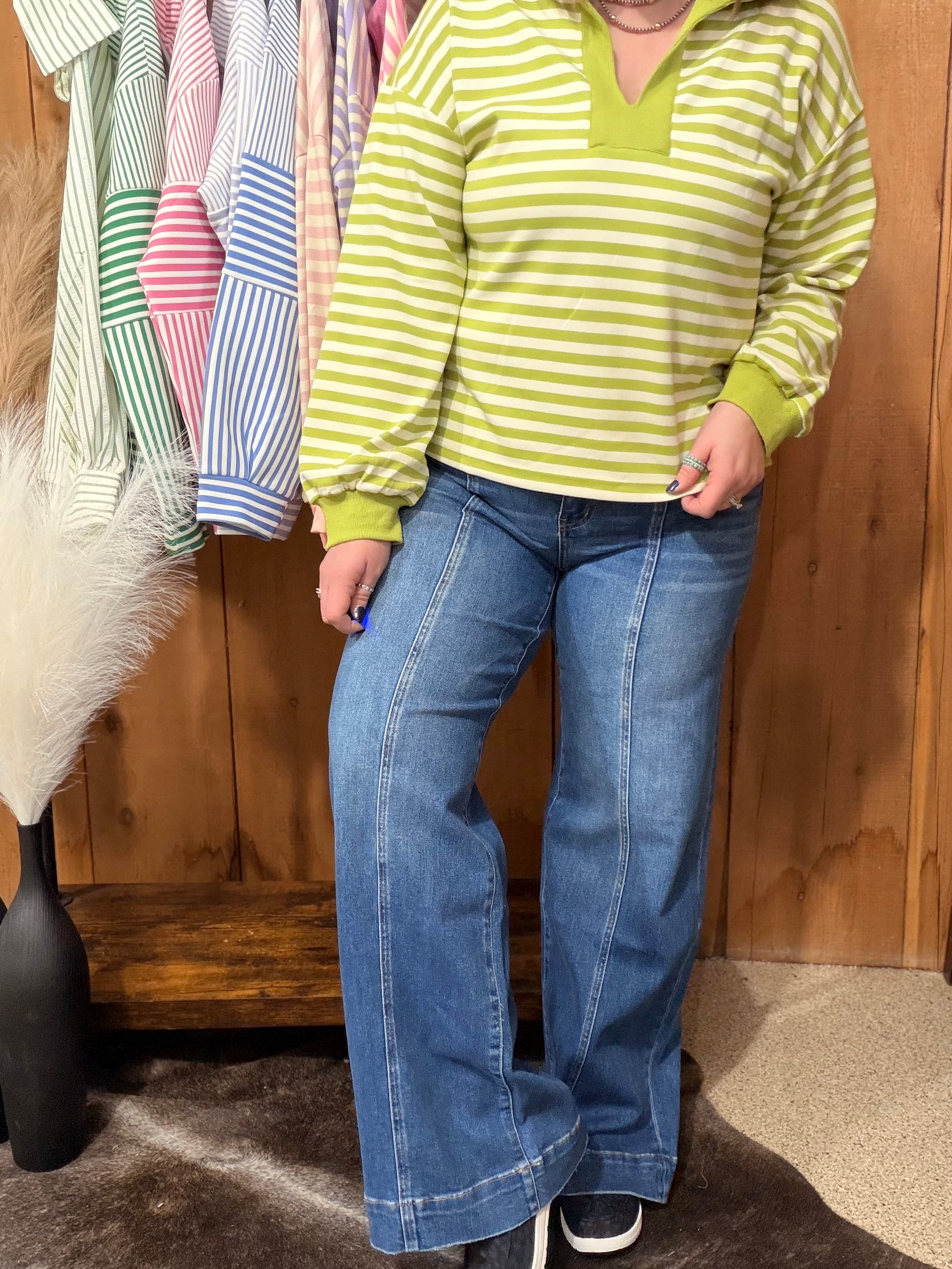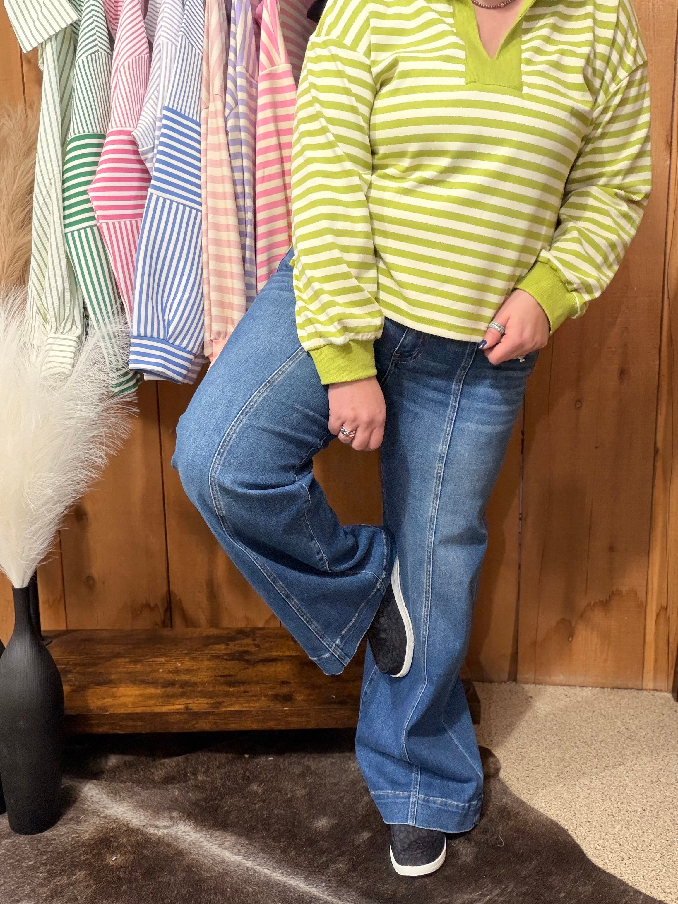 High rise, 33” inseam. 94% cotton, 5% polyester, 1% spandex