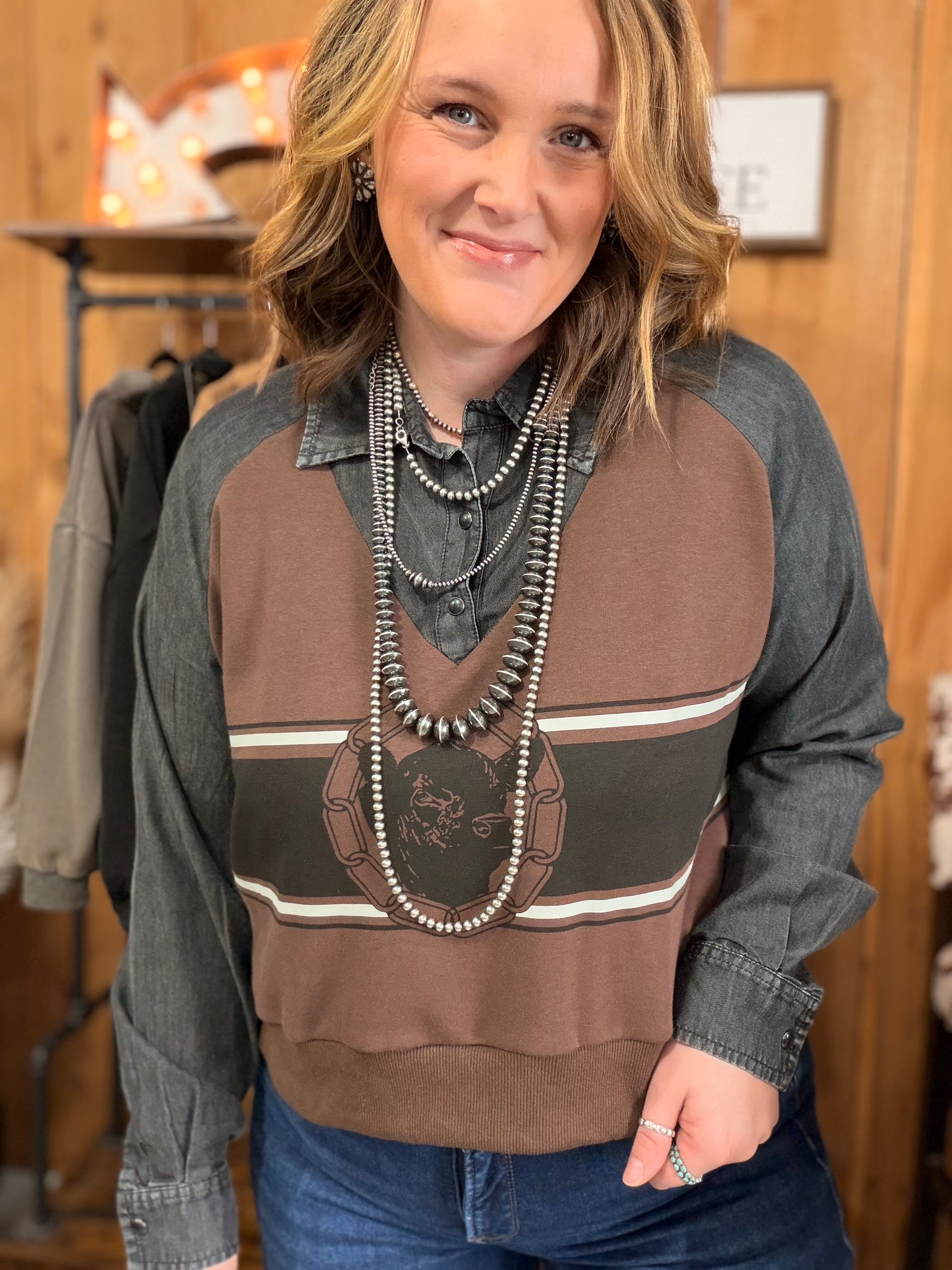 this top is giving that layering effect that we are OBSESSED with. it's a denim chambray with a printed graphic knit body.