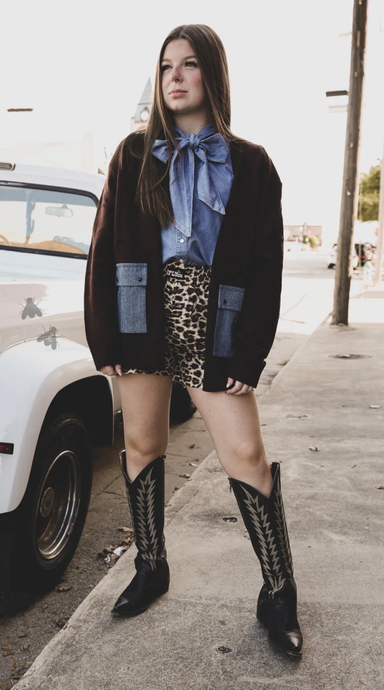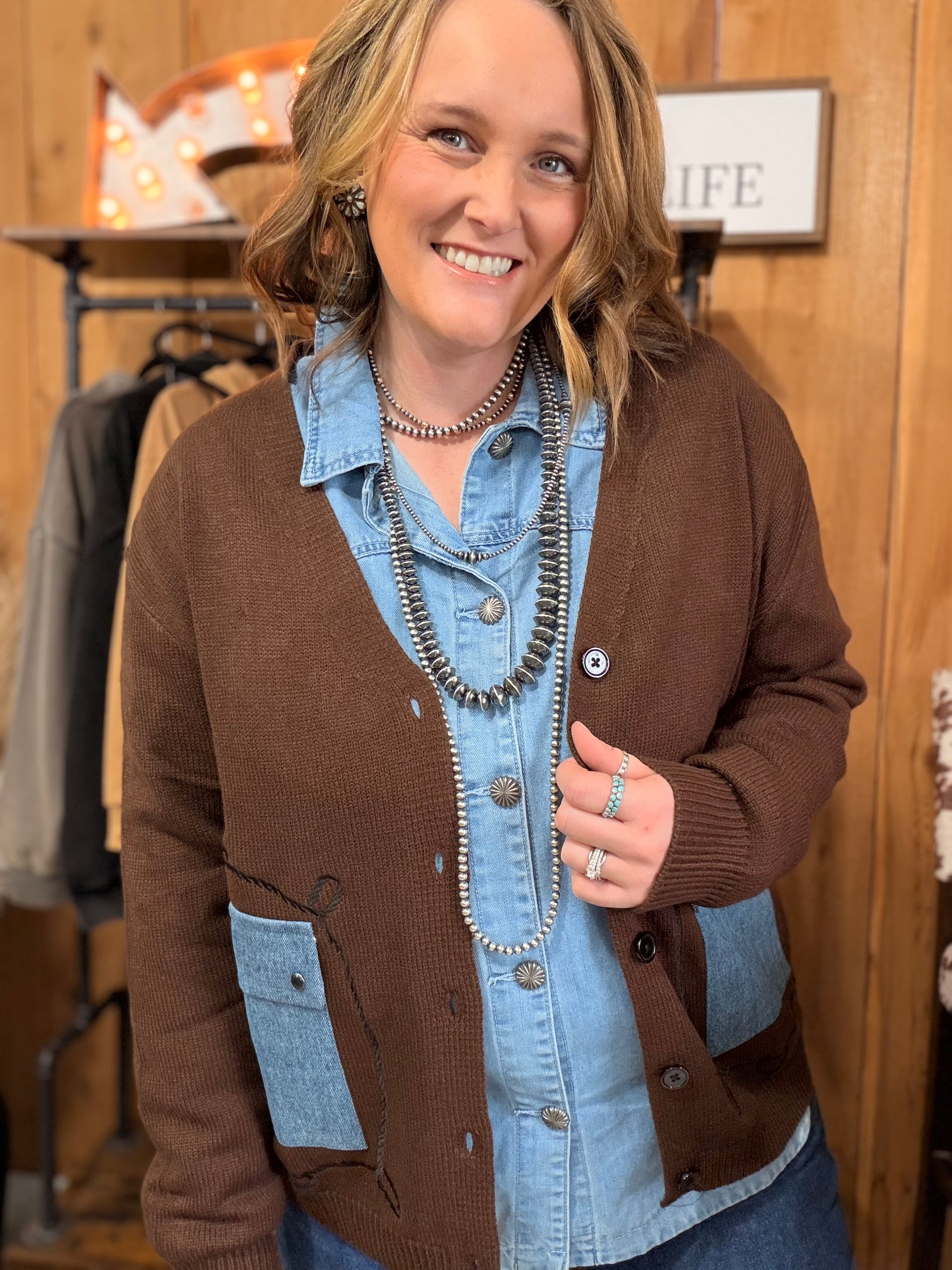 It’s a shorter cardigan fit with denim pockets and rope embroidery. This cardigan would make a GREAT transition piece for spring. you could pair it with some shorts, a basic top, and some sneakers.