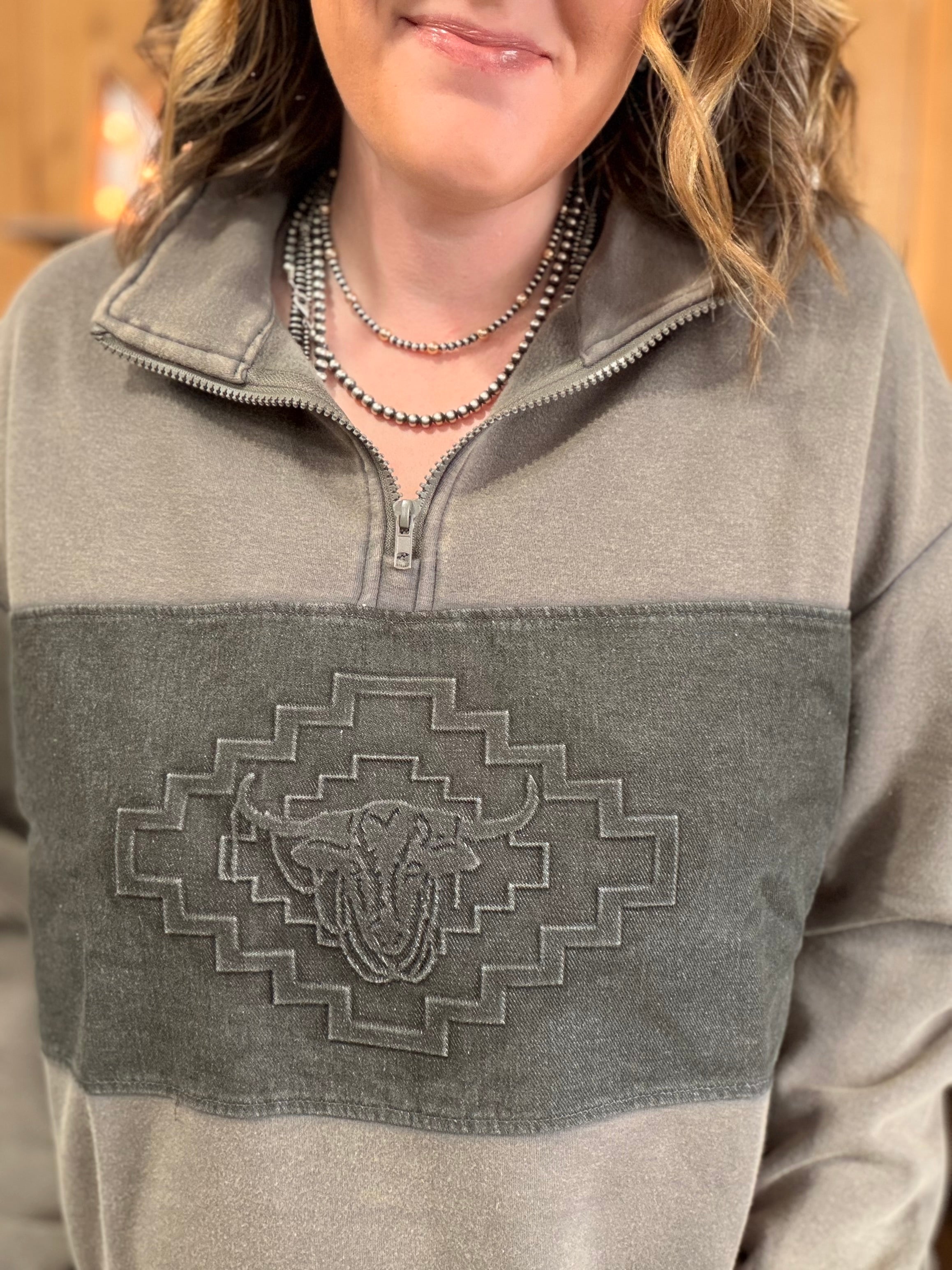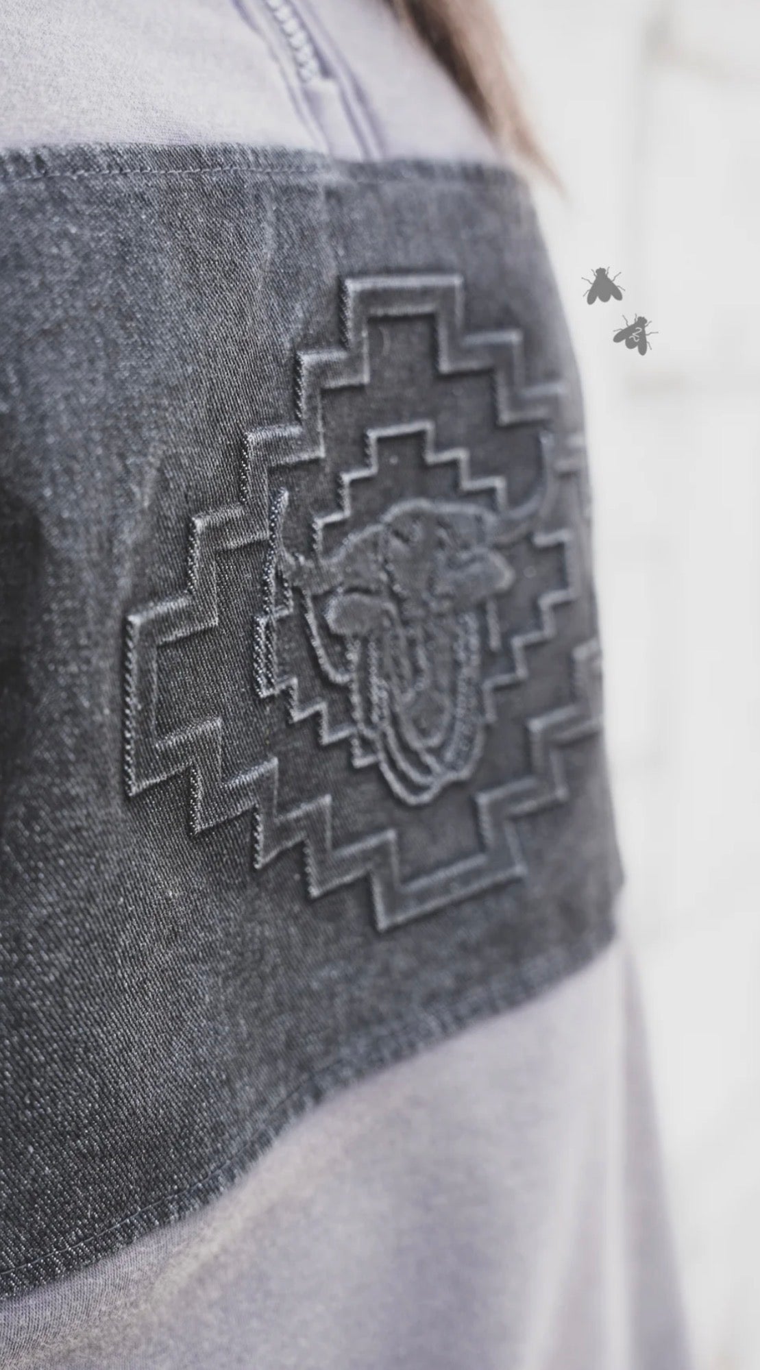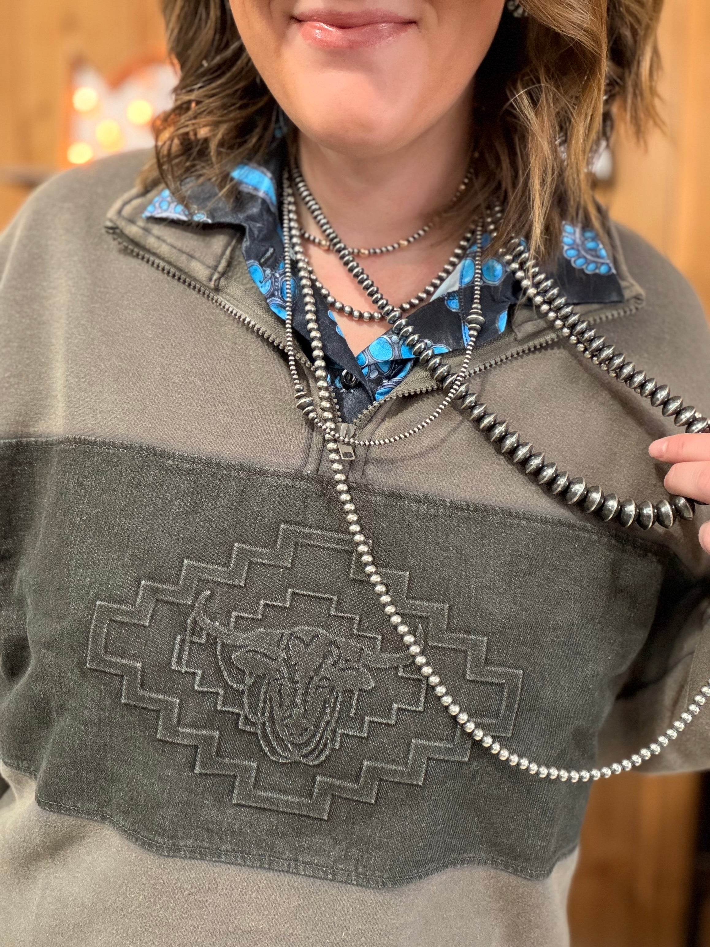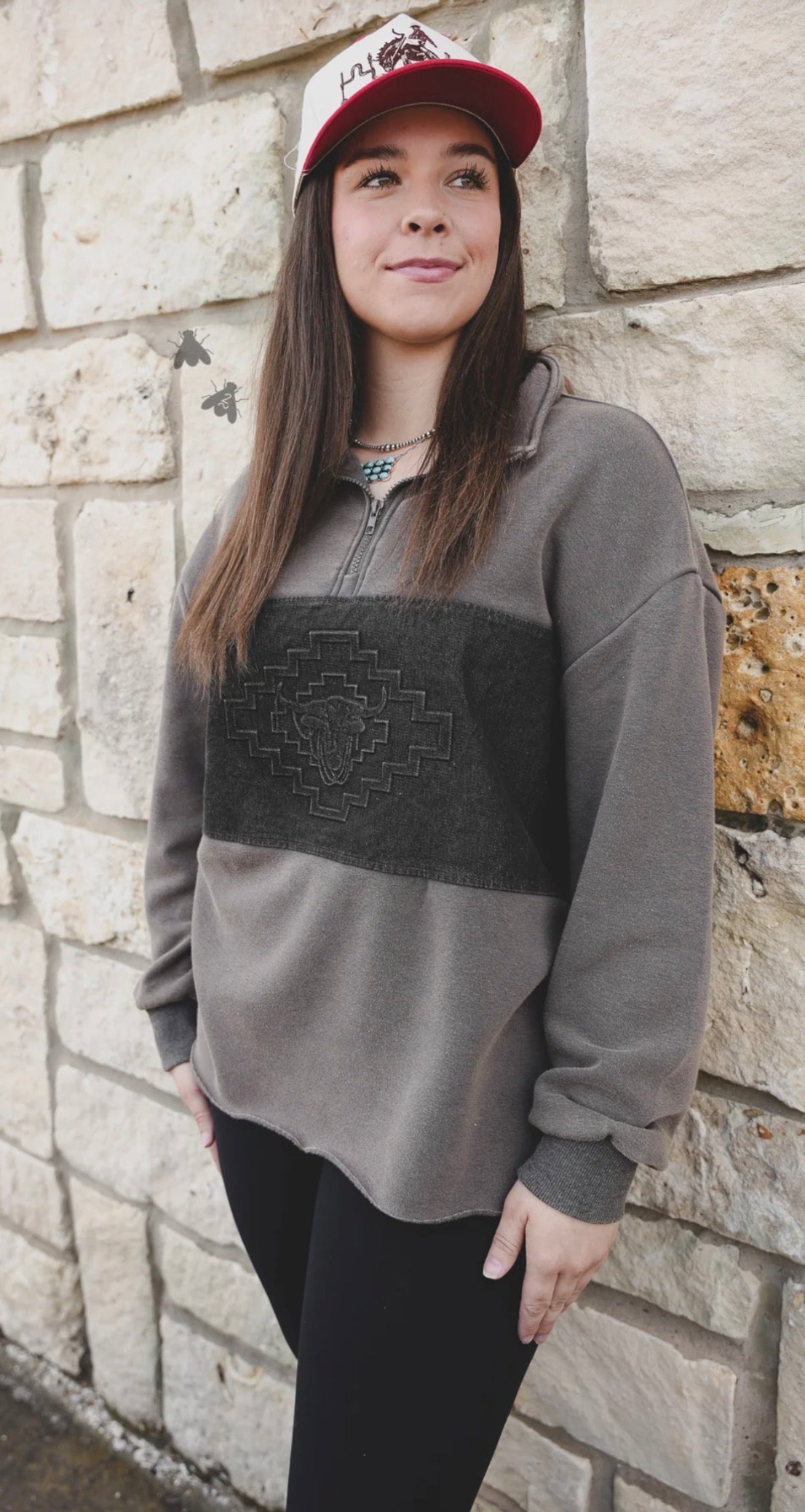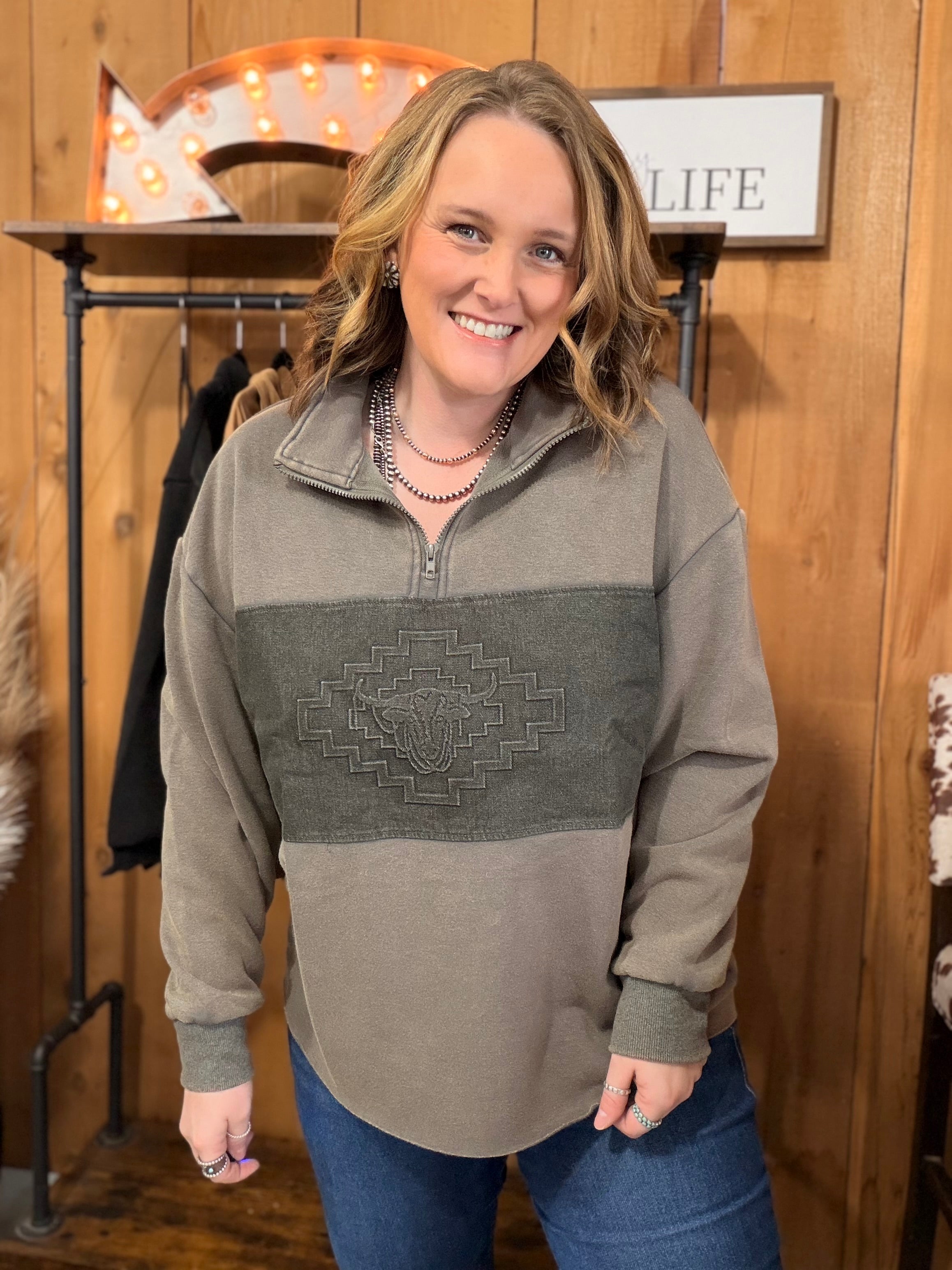 this pullover is a NECESSITY. we used our SUPER DUPER soft sweatshirt material... like seriously it's the SOFTEST. PLUS the middle is a embossed denim graphic - OBSESSED. style with a button up for a dressier or look!
