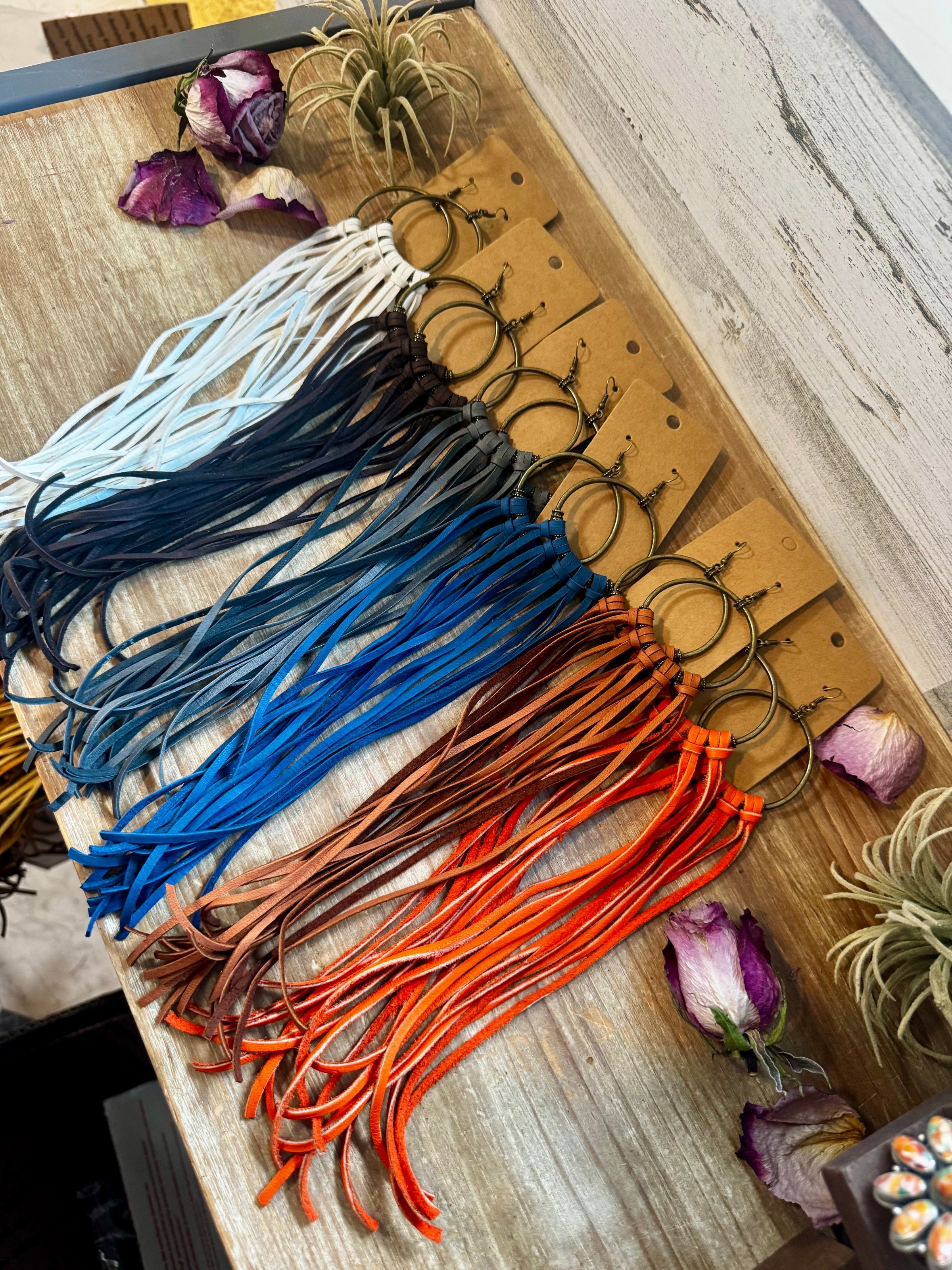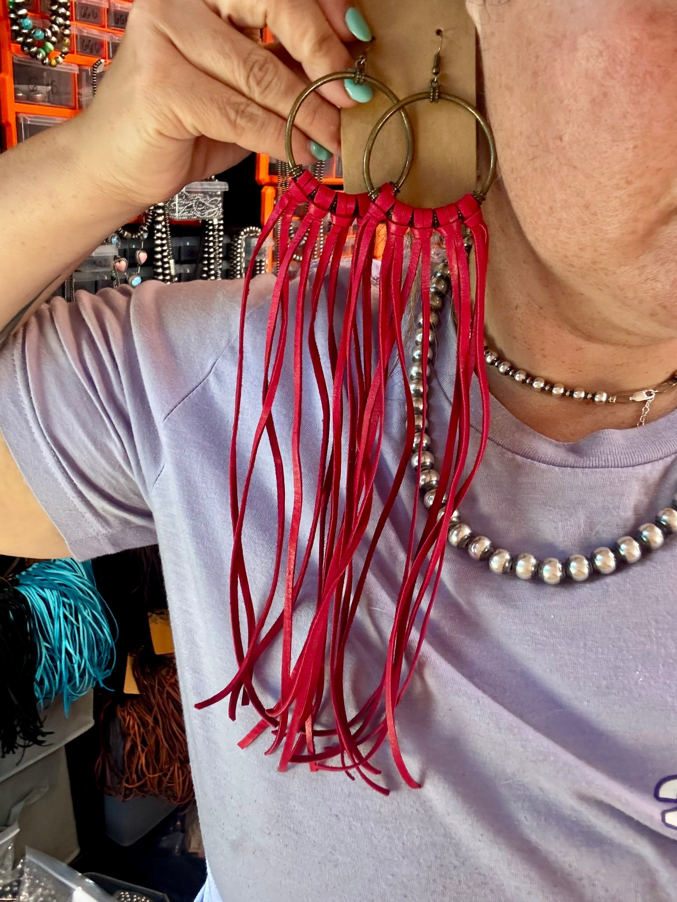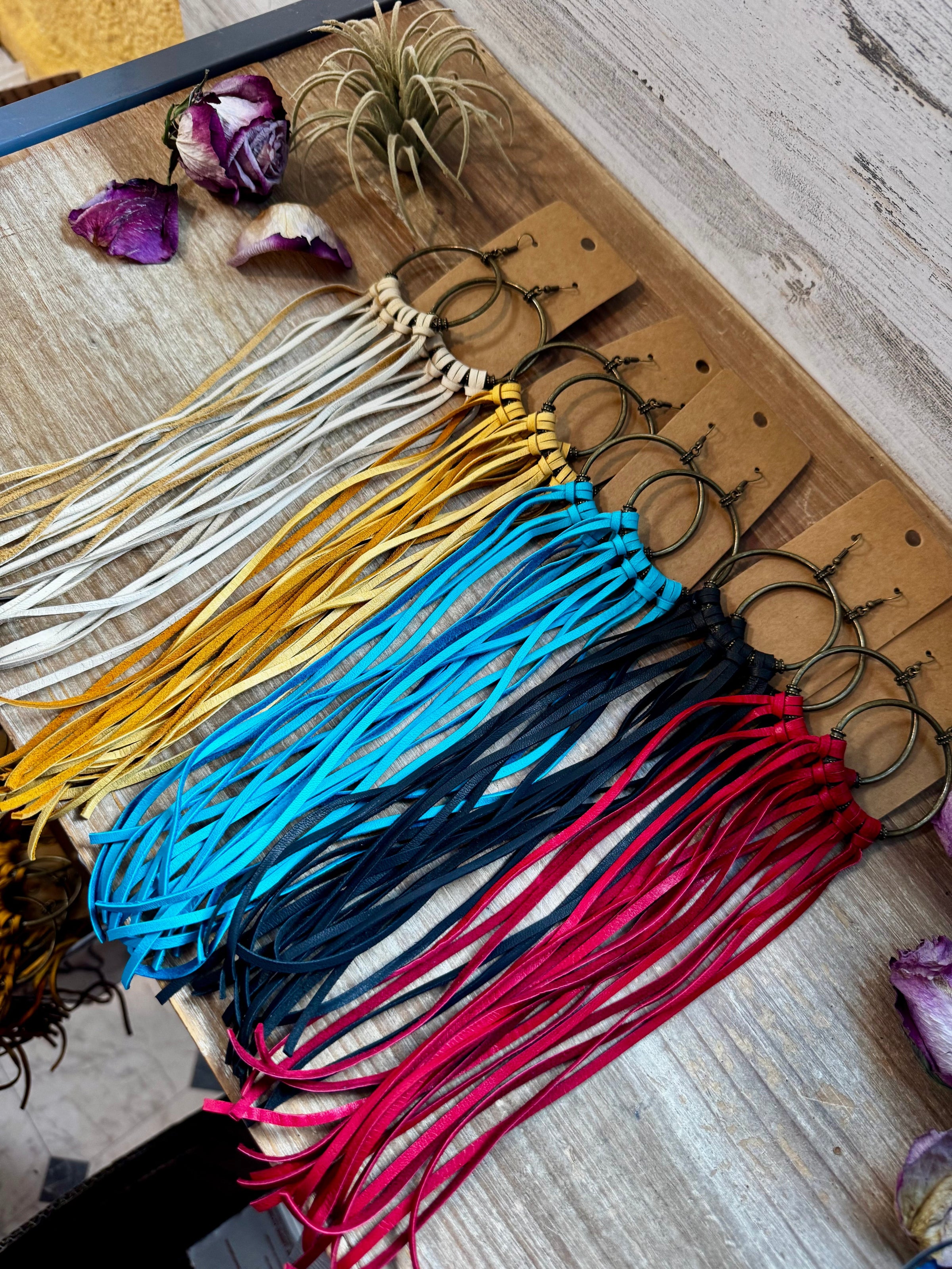 • 11" long leather hoop earrings