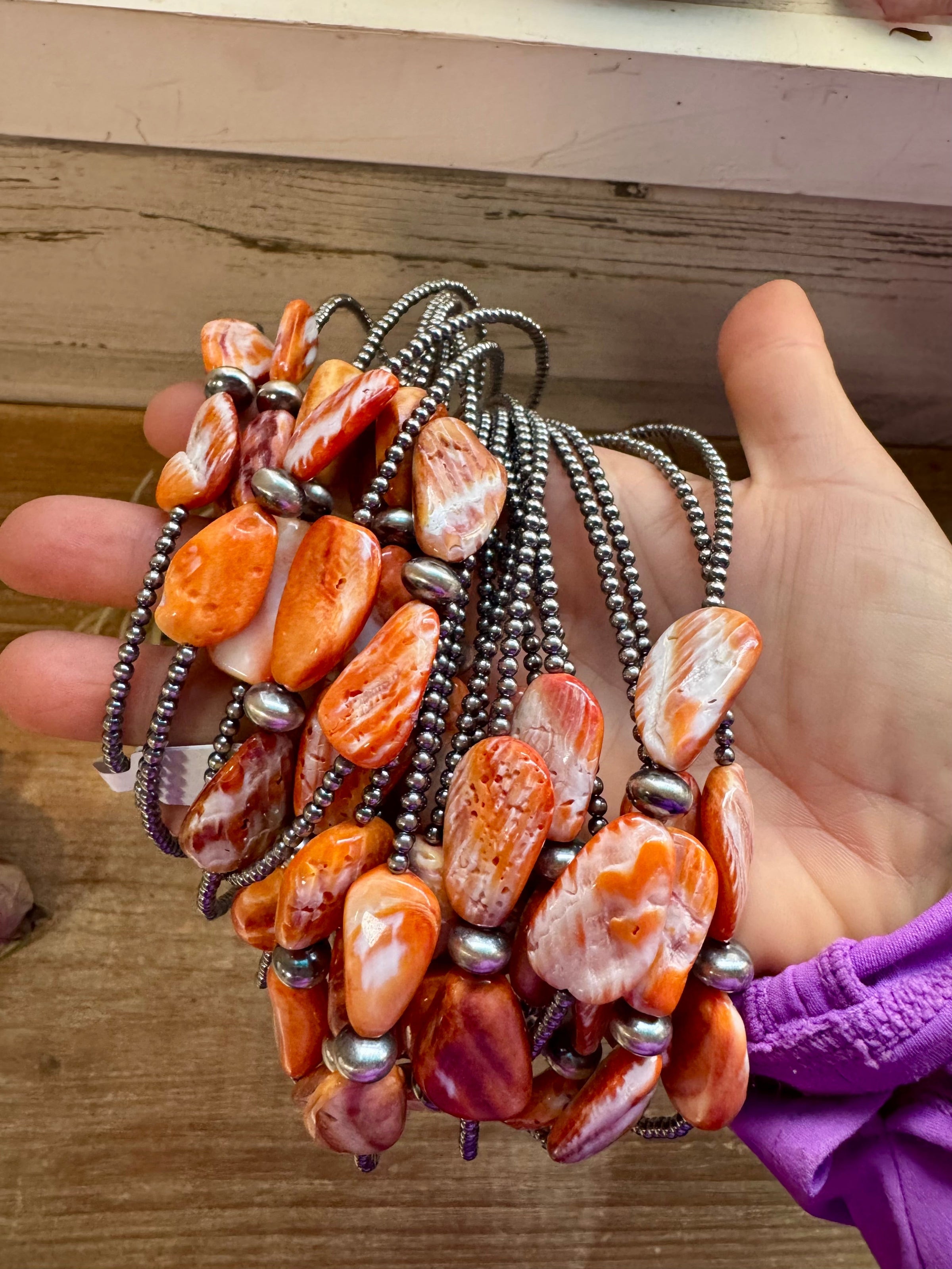 • Three orange-toned spiny oyster beads on each side